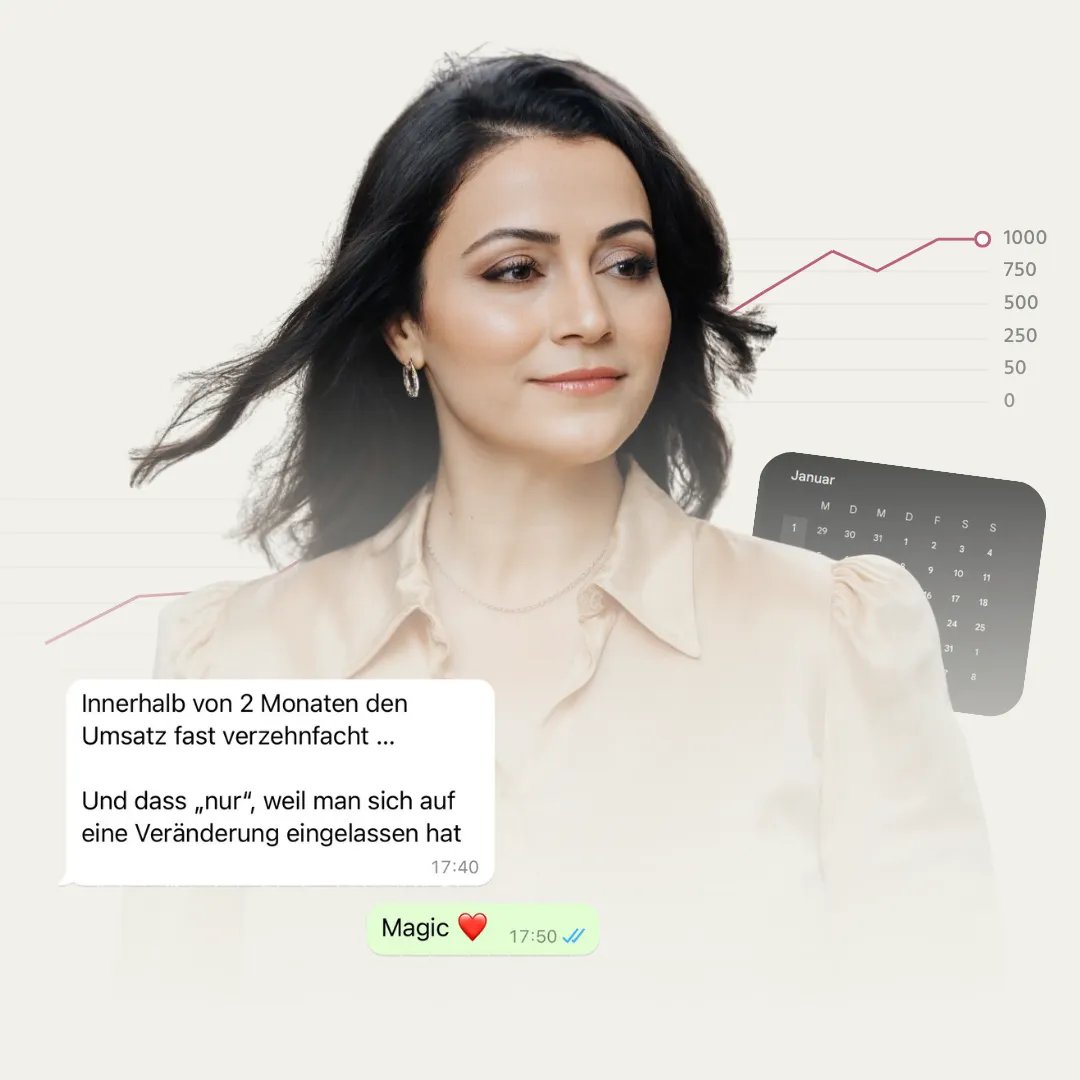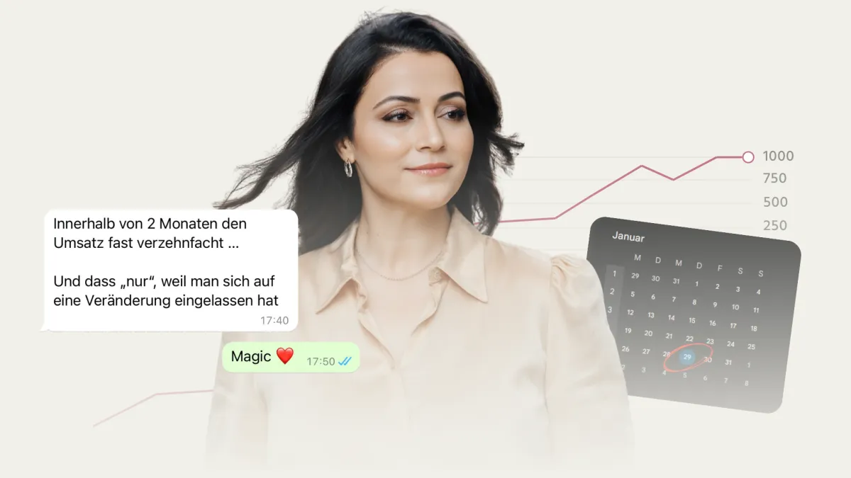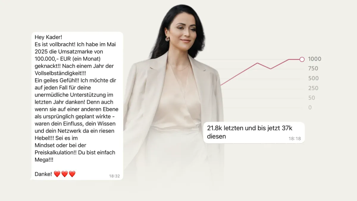 Ich bin Kader Ekici – Unternehmerin, Investorin und Mama. Ich habe mein Business rein organisch aufgebaut und bereits in meiner ersten Woche als Mentorin 6.000 € Umsatz erzielt. Wenige Wochen später folgte der erste fünfstellige Monat, im ersten Jahr ein sechsstelliger Jahresumsatz, ohne Website, ohne große Reichweite und ohne Bekanntheit als Business-Quereinsteigerin.