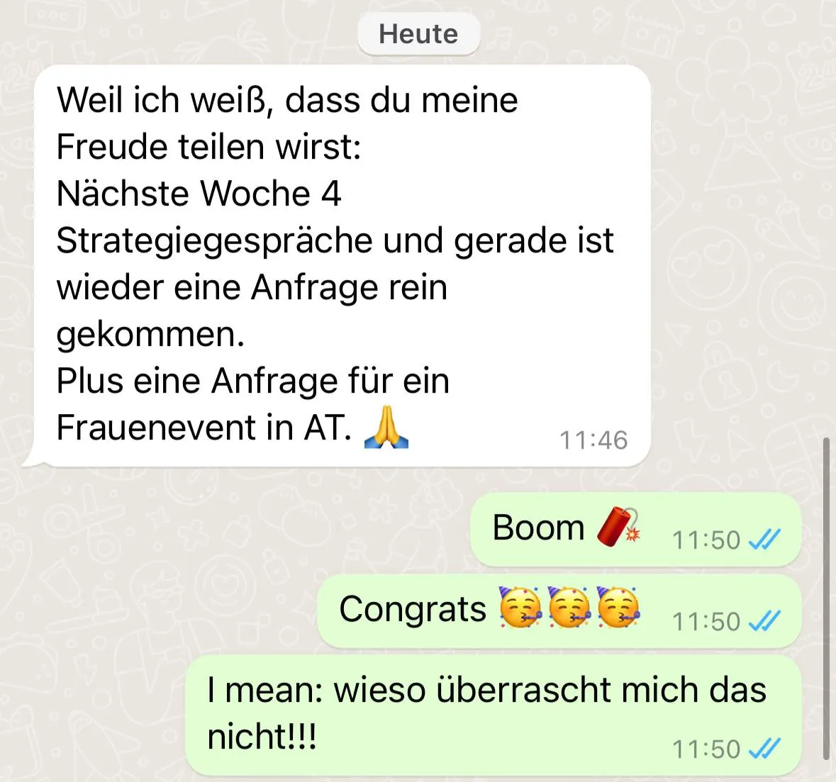 Heute gehöre ich zu den erfolgreichsten Onlineunternehmerinnen des DACH-Raums. Führe ein erfolgreiches Unternehmen, bin Speakerin, Investitorin und Podcasthost und begleite Frauen dabei, ihr Wissen in klare, hochpreisige Angebote zu verwandeln, sodass ihr Business nicht nur funktioniert, sondern trägt.